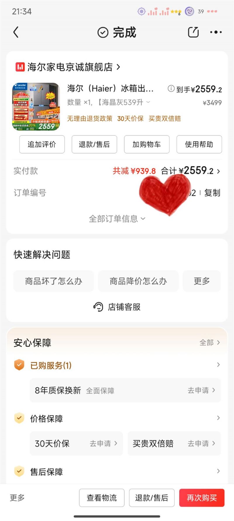 买完就通电试了一下 全新 买了保险 八年非人工破坏只换不修 纸箱子也在 朋友送了一台 所以便宜出 随时可以看 附近可以免费送货